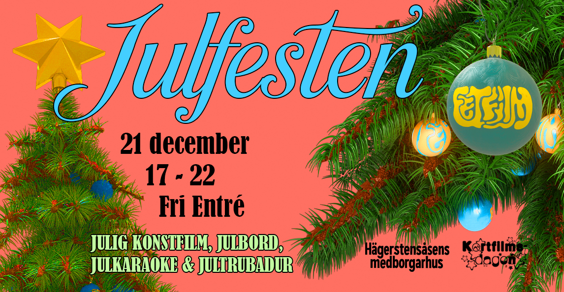 Kortfilmsdagen är här och vi ger er JULFESTEN, en hejdundrande filmfest på Hägerstensåsens Medborgarhus. Där samlas vi framför TV:n, julens självklara mötesplats, för att tillsammans förundras över konstfilmen som dagen till ära iklätt sig tomtekostym.